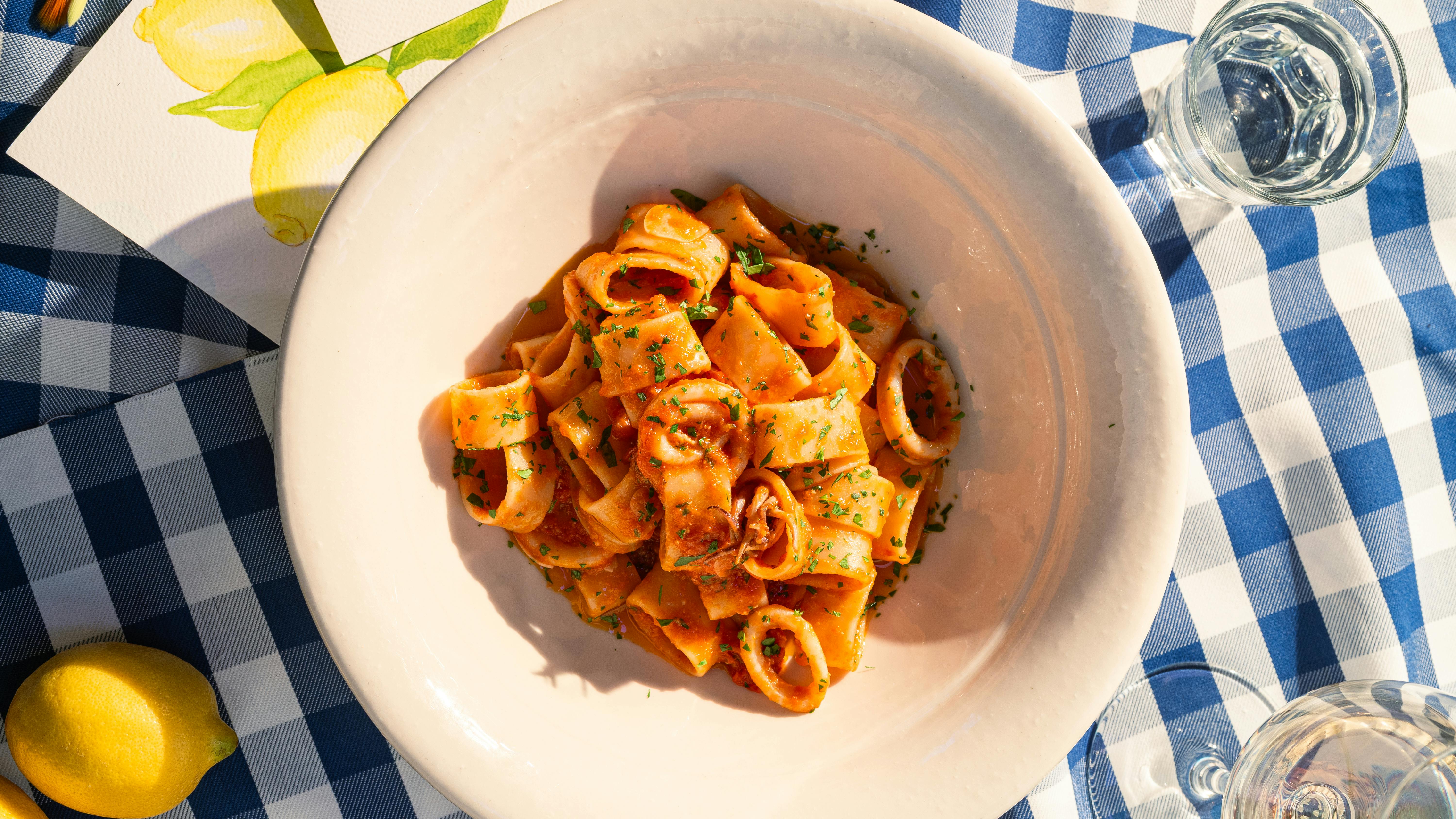 A mouth-watering Italian pasta dish served on a blue checkered tablecloth outdoors.